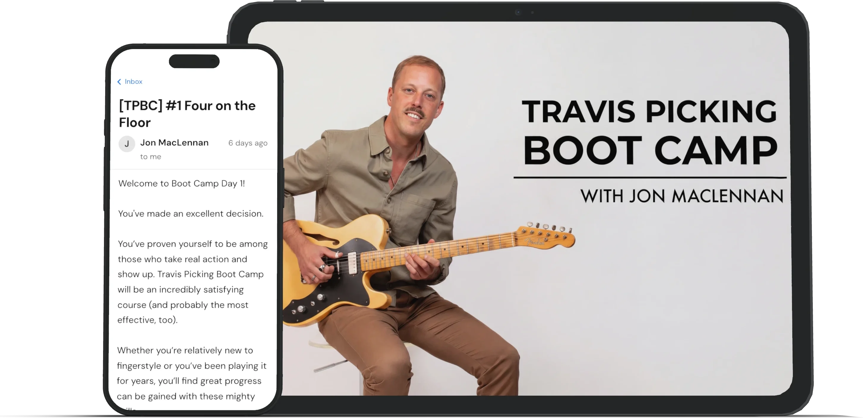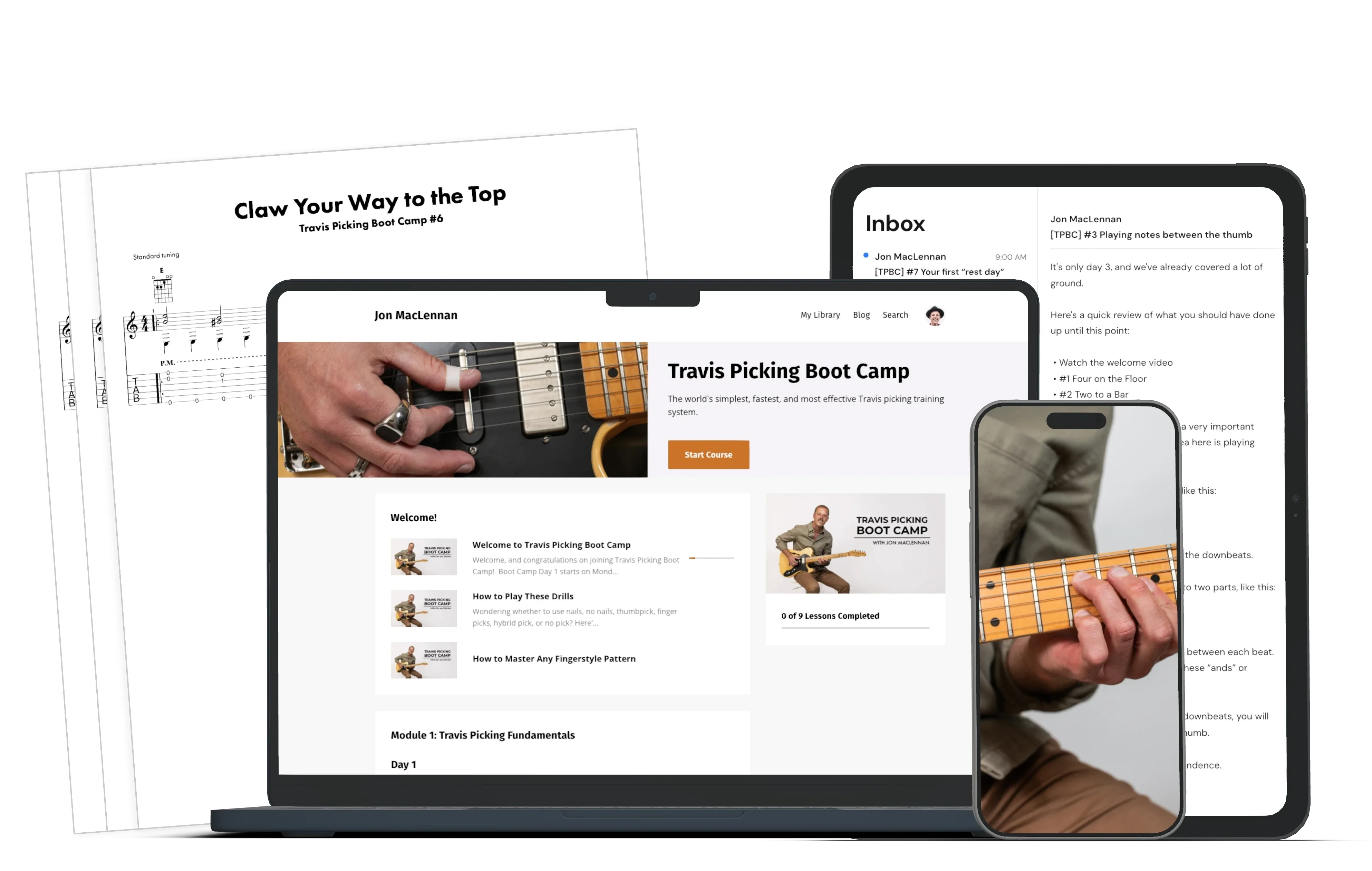 So every day of Travis Picking Boot Camp, you'll receive one email from me — with that day's 10-15 minute lesson and links to videos, TABS, and sheet music to complete it.