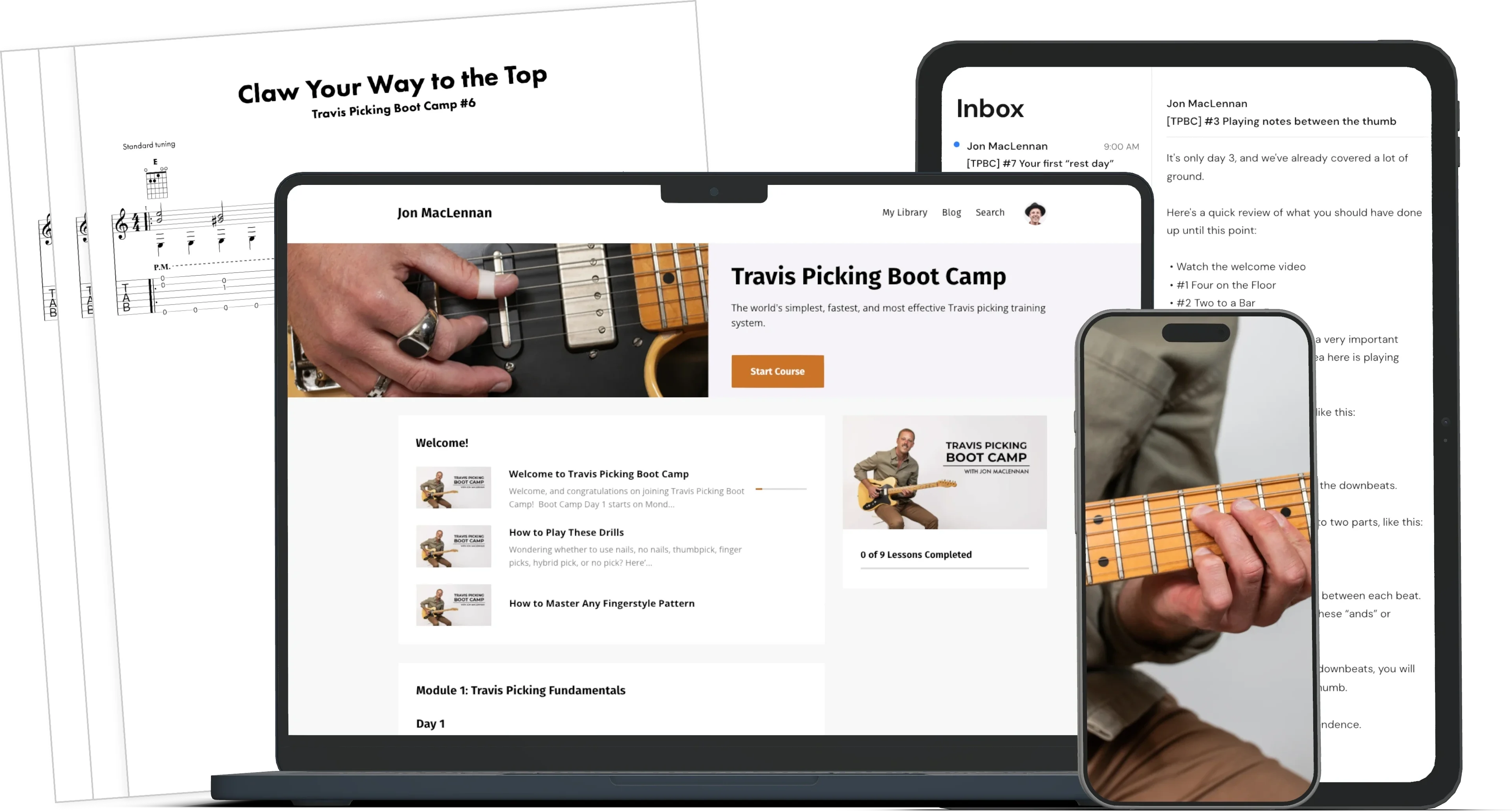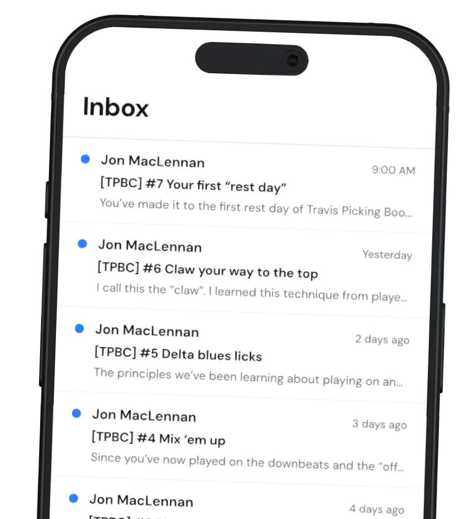 When you join, you'll receive email assignments delivered straight to your inbox. Each one contains specific Travis picking patterns and fundamentals.