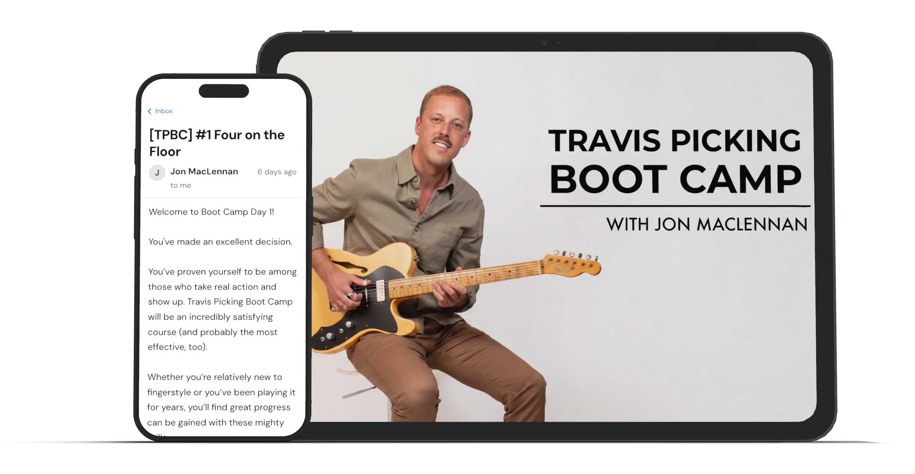 Travis Picking Boot Camp is a 7 week fingerpicking training system that takes you from wherever you are now — newer to fingerpicking, intermediate, advanced, and everything in between — and rapidly develops your fingerstyle independence.